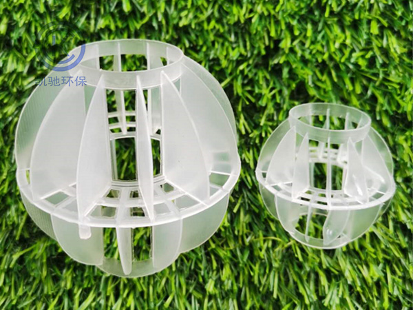 采用聚丙烯(PP)塑料制成球狀,由兩個半球合成一個球形,每個半球上根據(jù)設(shè)計需要有8-12個半扇形葉片,兩個半球的扇形葉片相互錯開。該填料特點(diǎn)是比表面積大,空隙率較高。但是由于葉片數(shù)偏多,彼此間有遮蔽效應(yīng),不利于液體分布和潤濕;液體大多在球體空心柱聚集,阻礙氣體暢通,因此阻力較大。此種填料多用于廢氣處理和水處理工程